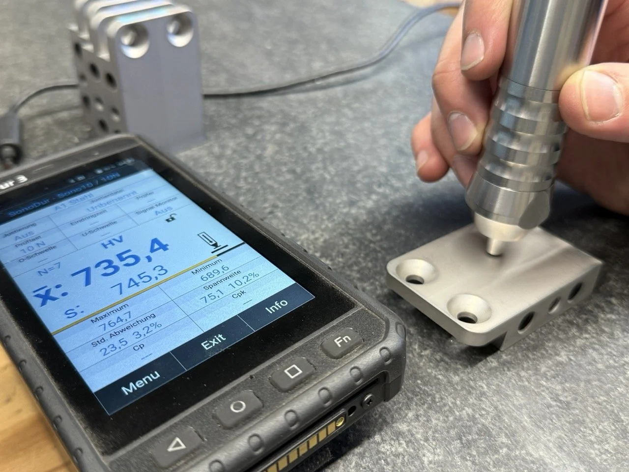 Die Ultraschallprüfung arbeitet mit minimaler Kraft und hinterlässt kaum sichtbare Spuren. Ideal für fertig bearbeitete Präzisionsteile, sensible Oberflächen und harte Nitrierschichten.